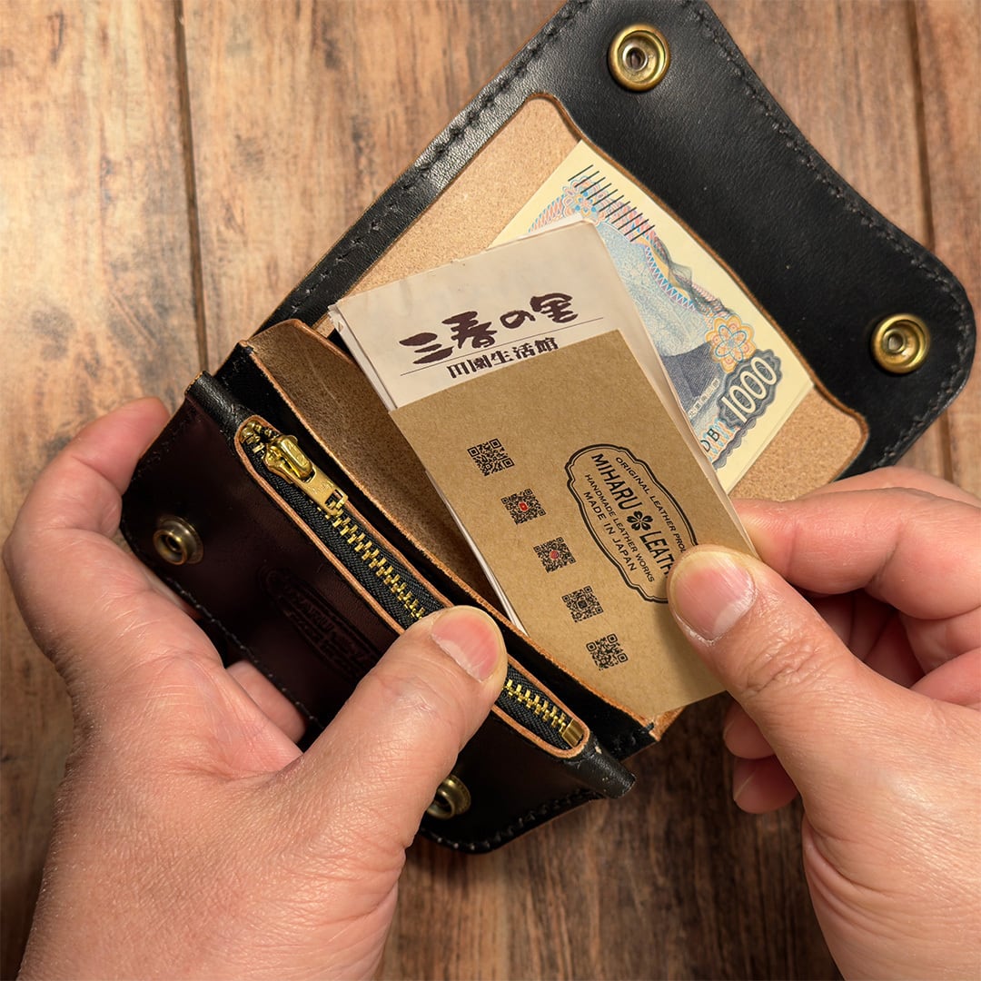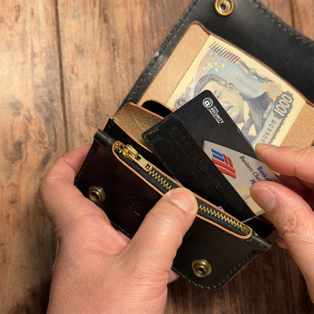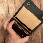 お札を折らずに収納できるショートトラッカーウォレット。