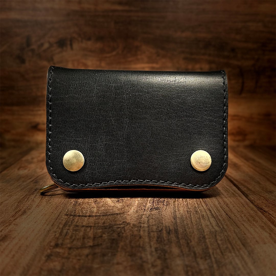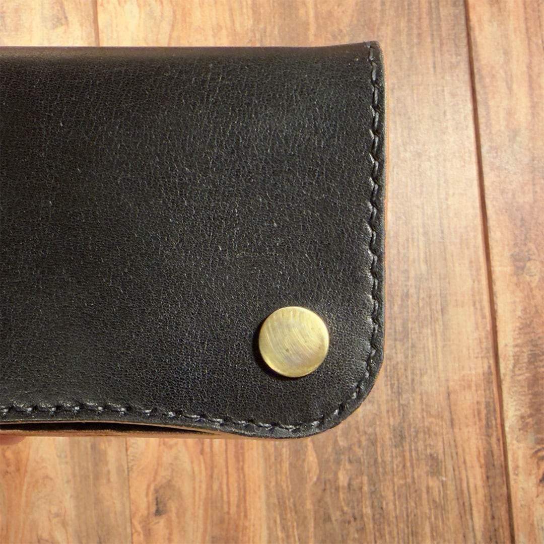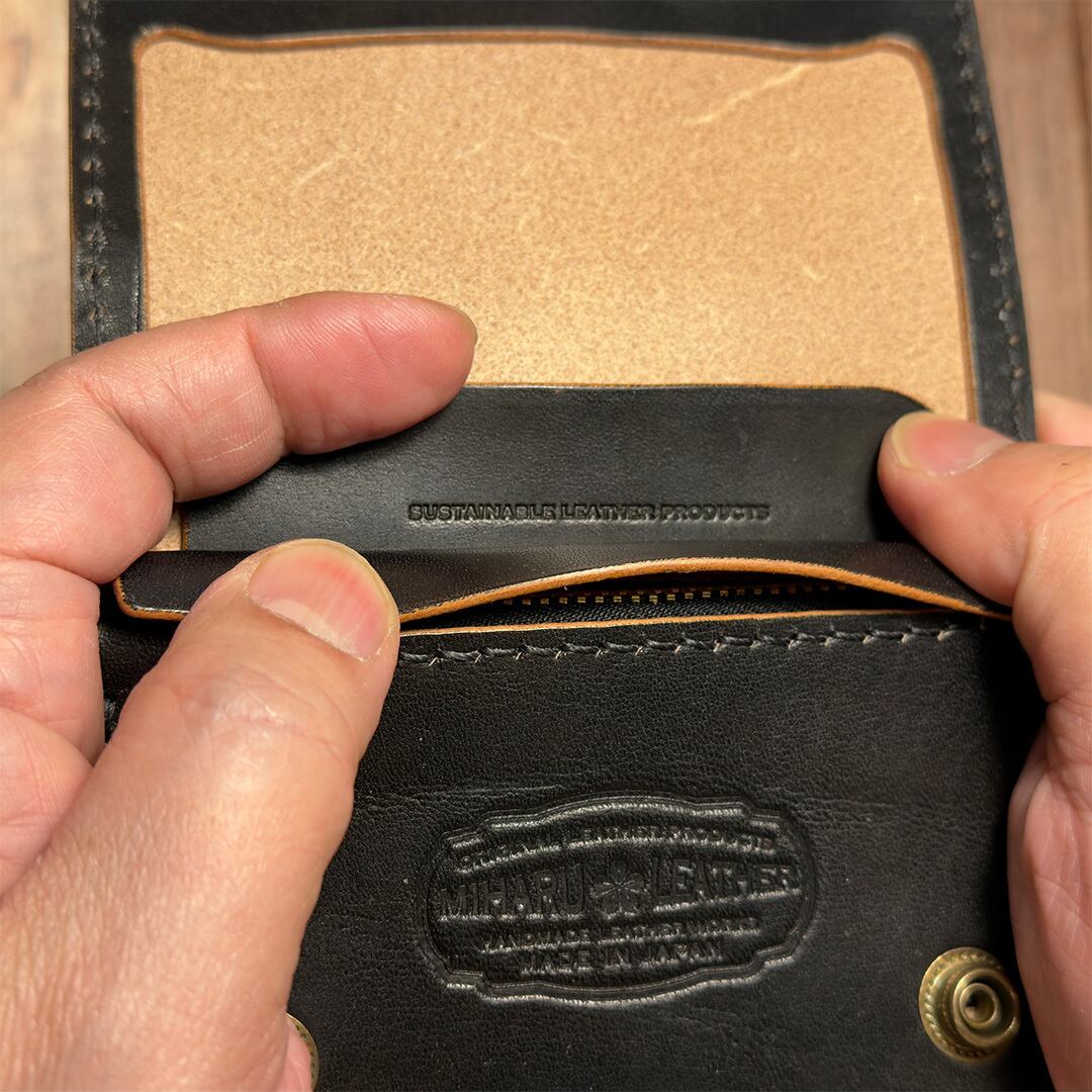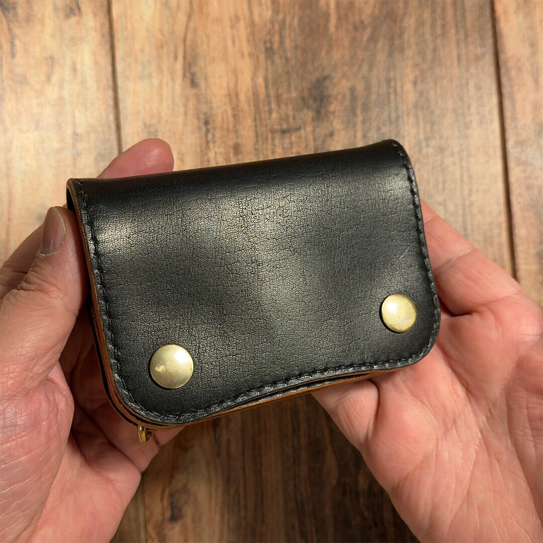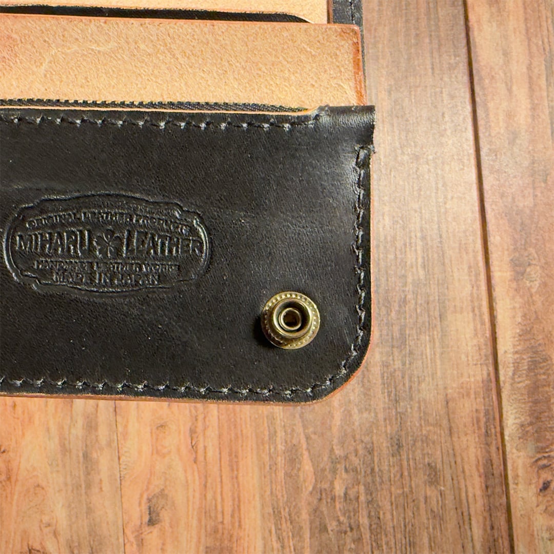 ナチュラルのヌメ革を手染め(丘染め)ブラックで仕上げています。