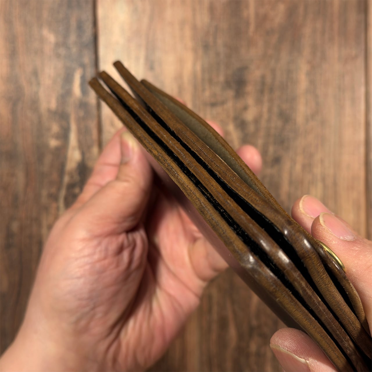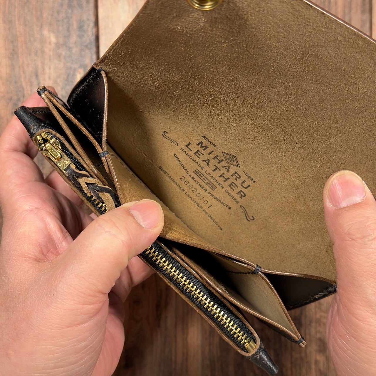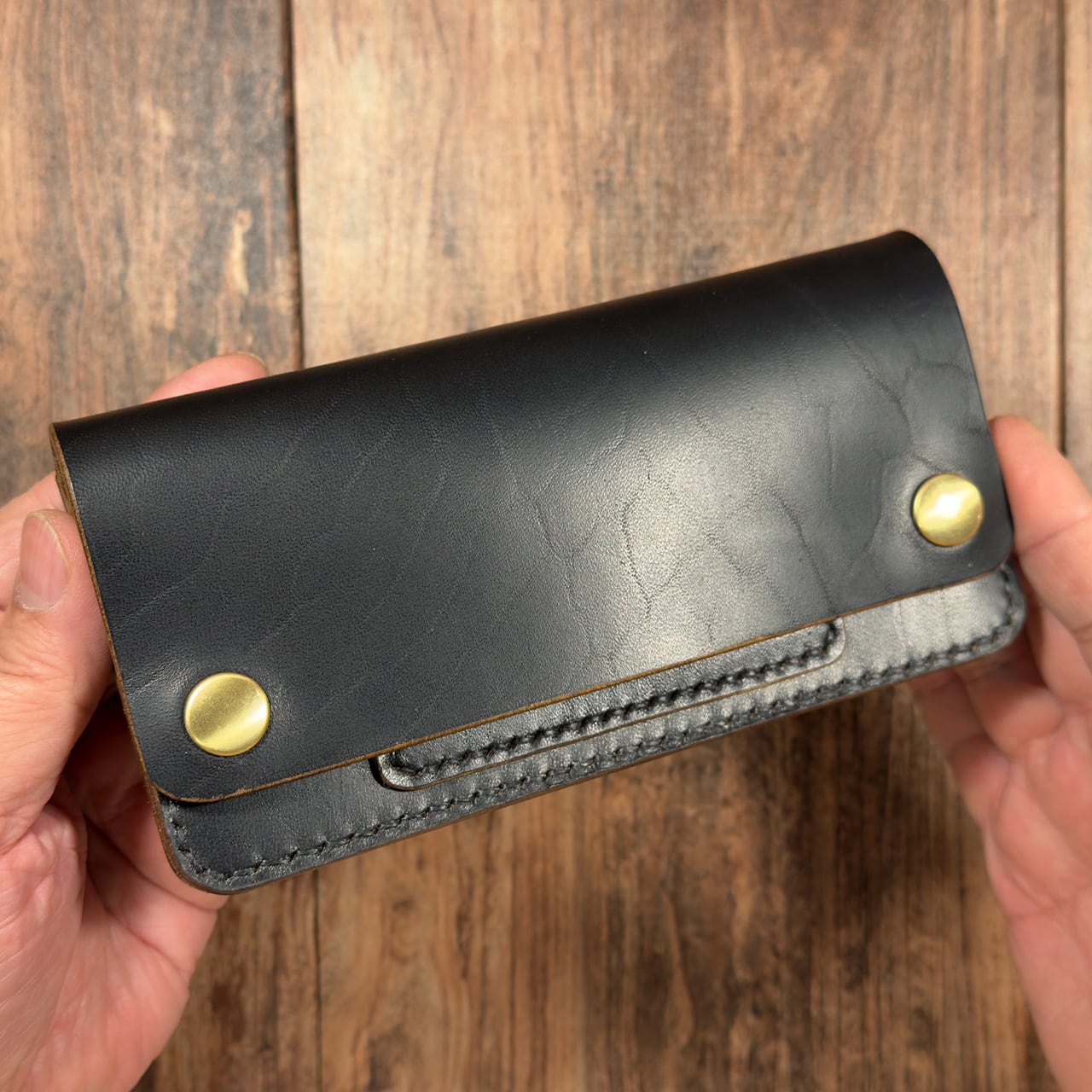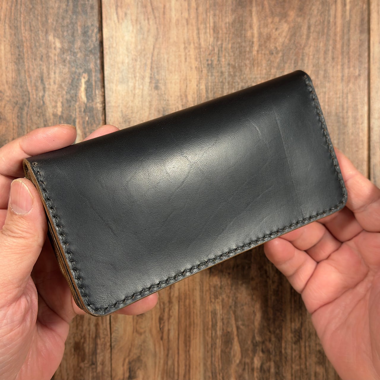 植物タンニンで鞣し、茶系染料で下地を染めた後、黒の顔料で仕上げた茶芯ブラックです。
