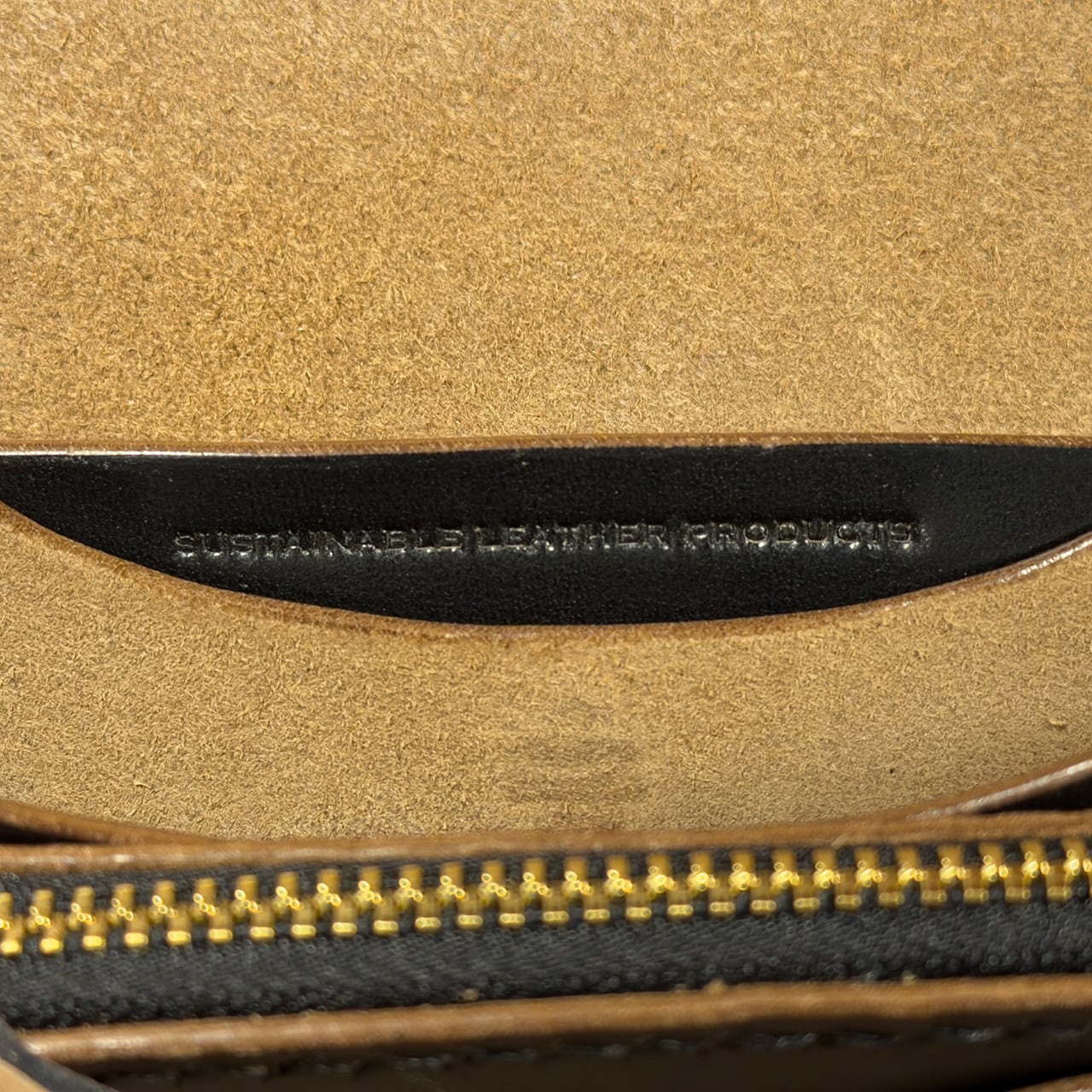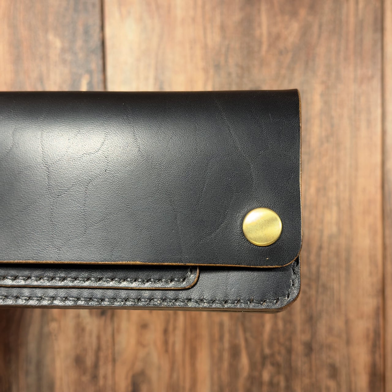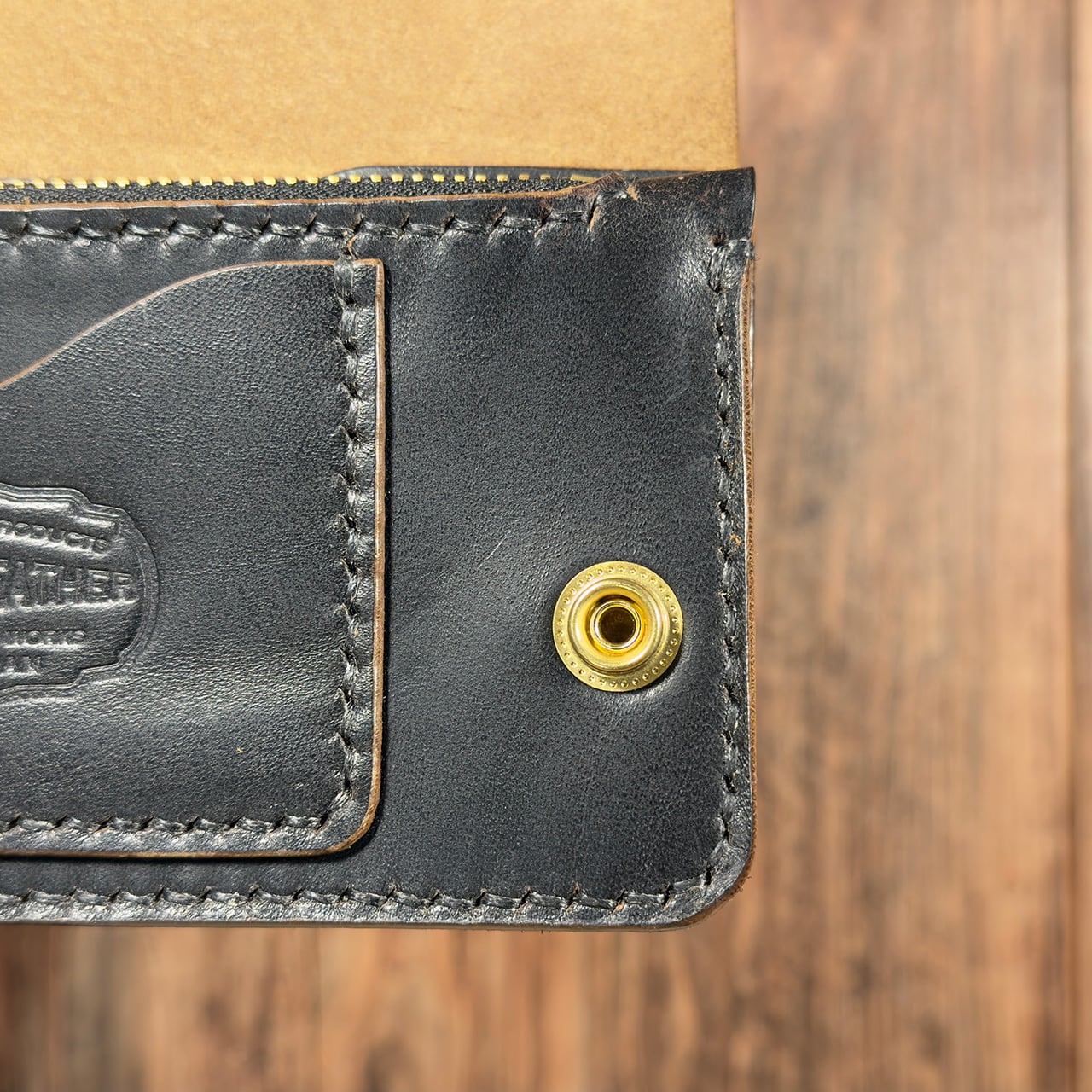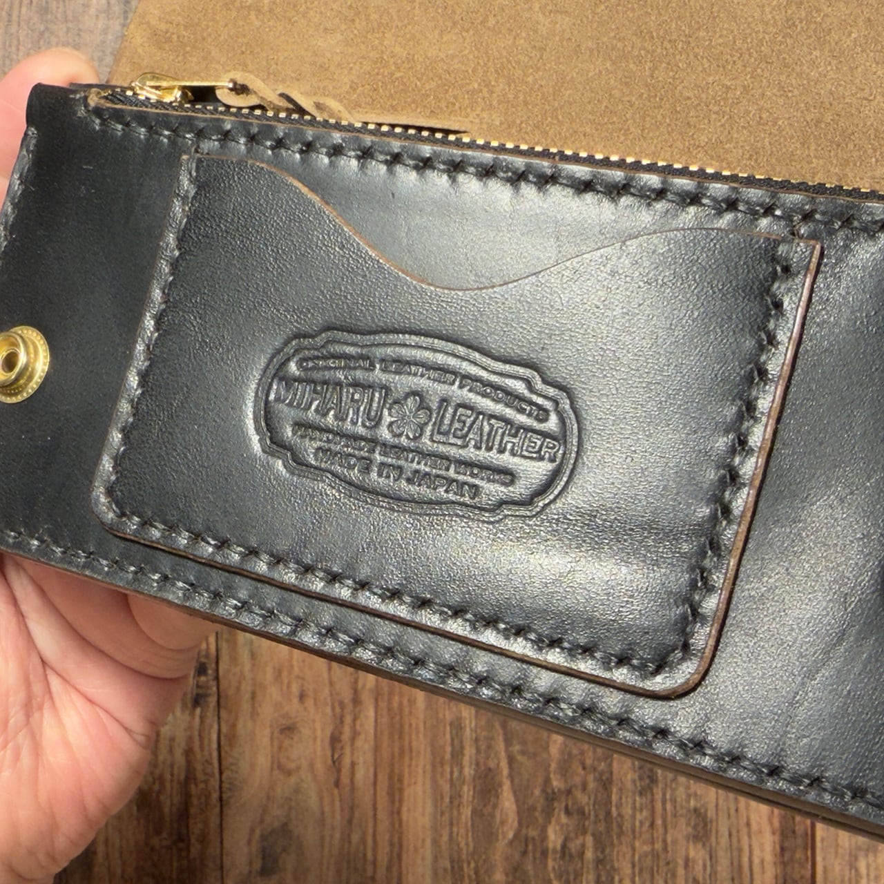 植物タンニンで鞣し、茶系染料で下地を染めた後、黒の顔料で仕上げた茶芯ブラックです。