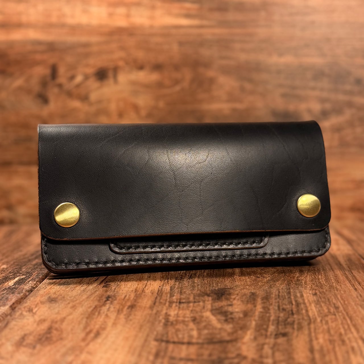 ロングトラッカーウォレットは、紙幣を折らずに収納できる横長設計。収納力を備えたスタンダードな構造です。